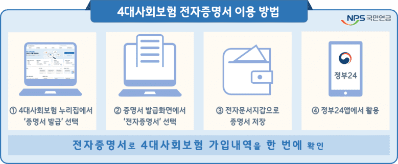 4대사회보험 전자증명서*는 사업장 또는 개인의 국민연금, 건강보험, 고용보험 및 산재보험 가입내역을 한 번에 확인할 수 있는 증명서로 4대사회보험 정보연계센터 누리집(www.4insure.or.kr)에서 신청할 수 있다.