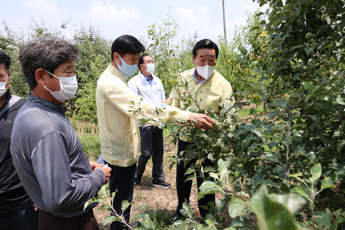 박문희 의장은 정상교(충주1) 의원과 충북도, 충주시 관계자와 함께 신니면 화석리 사과, 복숭아 농가와 노은면 신효리 담배 농가를 찾아 피해 상황을 꼼꼼히 확인한 후 실의에 빠진 주민들을 위로하며 애로사항을 청취했다.