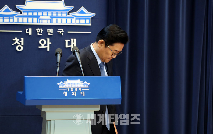 롯데홈쇼핑에서 불법 후원금을 수수했다는 의혹을 받고 있는 전병헌 청와대 정무수석이 16일 오전 춘추관에서 사의 표명을 마치고 발언대를 내려오고 있다. 2017.11.16.