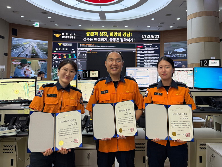 - 구급상황관리센터, 신속한 판단과 응급처치 안내로 환자 생존 기여 [세계타임즈=경남 최성룡 기자] 경상남도 소방본부(본부장 이동원)는 16일 위급 상황에서 침착하게 대응해 소중한 생명을 구한 119종합상황실 소속 직원 5명에게 '하트세이버 인증서'를 수여했다고 밝혔다.