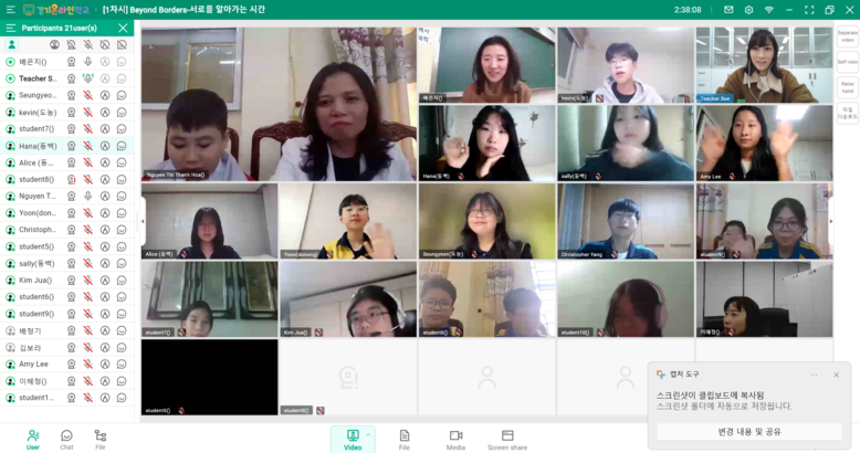 이번 프로젝트는 실시간 온라인 기반의 프로젝트형 수업으로 구성되며, 학생들은 각자의 문화를 소개하고 정서적 교류 활동에 참여한다. 이를 통해 온라인 환경에서도 자연스럽게 일상과 생각을 공유하며 상호 이해를 높이고, 문화적 다양성을 존중하는 태도를 기르게 된다. 또한 학생 주도 프로젝트를 직접 설계하고 운영하는 경험을 통해 자기주도성과 협업 역량도 강화하게 된다.