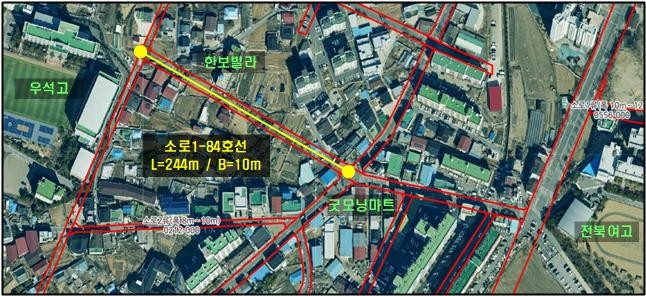 이번 개설된 도로 구간은 우석고등학교에서 여의동 굿모닝마트까지 이어지는 연장 244m 규모의 주택가 내부 신설 도로이다.