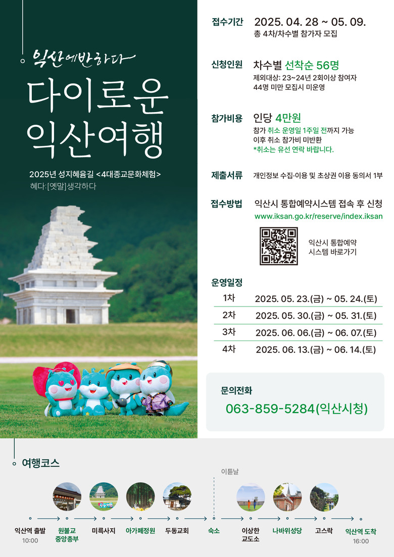 참여자들은 익산역에서 출발해 △원불교 총부 △미륵사지 △두동교회 △나바위성당 등 익산을 대표하는 4대 종교 성지를 순례한다. 아울러 스님과의 차담, 선(명상) 체험, 순례길 걷기 등 깊이 있는 체험 프로그램도 함께 진행된다.