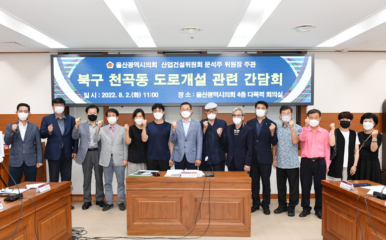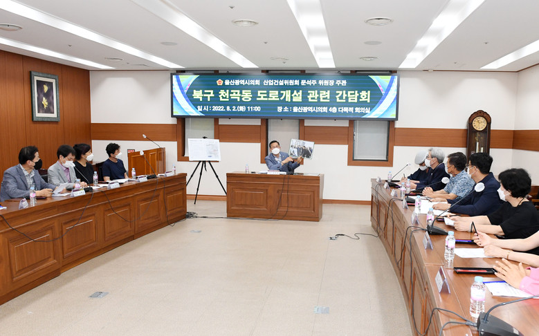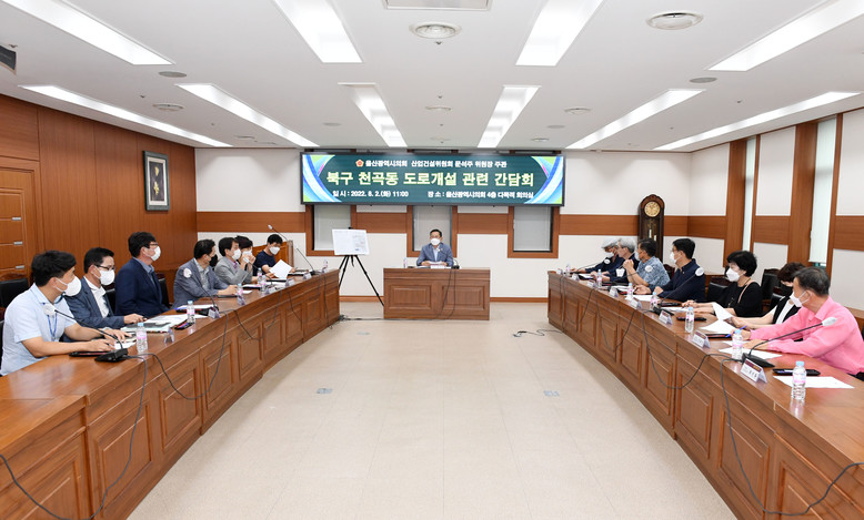 [울산 세계타임즈=이호근 기자] 울산광역시의회 문석주 산업건설위원장은 8월 2일 오전 11시, 시의회 4층 다목적회의실에서 북구 지역 아파트 주민대표 등 주민 12명과 울산시 관계자가 참석한 가운데 ‘북구 천곡동 도로개설 관련 간담회’를 가졌다.