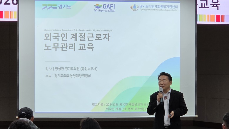 [경기도 세계타임즈=송민수 기자] 경기도의회 농정해양위원회 방성환 위원장(국민의힘, 성남5)은 31일 이천시 농업기술센터에서 열린 「2025 외국인 계절근로자 고용주 교육」에 특강 강사로 참여해, 외국인 근로자 인권 보호와 고용관계 법규 준수의 중요성을 강조했다.