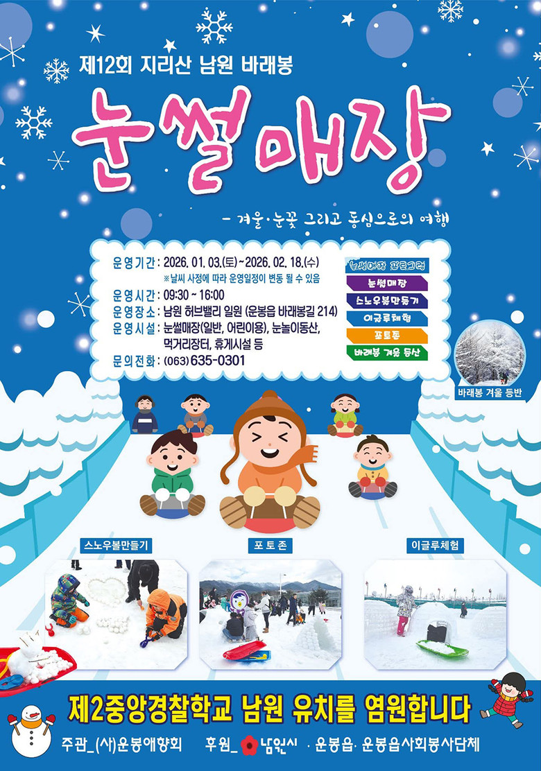 한편, 운봉 바래봉 일원에서는 2026년 1월 3일부터 2월 18일까지 눈꽃축제가 개최된다. 축제 기간 동안 먹거리 장터, 썰매장, 눈놀이 동산, 휴게시설 등이 운영돼 겨울 체험콘텐츠를 한층 강화하며, 온 세상이 하얀 설경으로 뒤덮인 풍경 속에서 ‘춥지만 그래서 더 특별한 남원의 겨울’을 직접 체감할 수 있다.