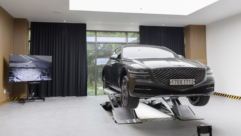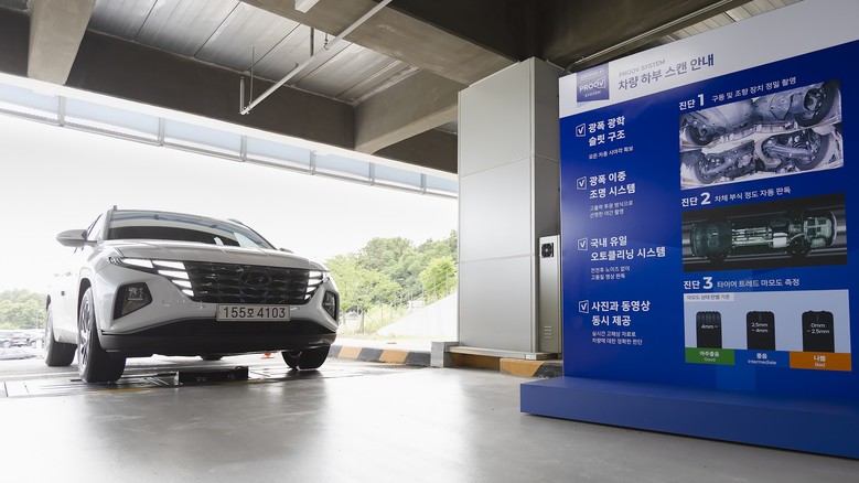 | ▲ 차량이 바닥에 설치된 ‘하부 스캔 장비’를 통과하여 차량의 하체 상태를 정밀 점검하고 있다 |