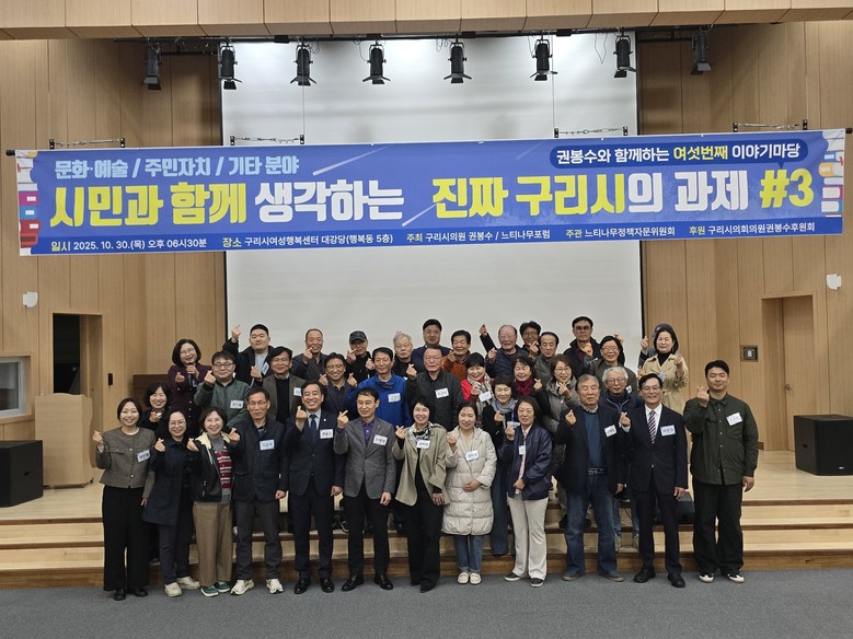 [구리시 세계타임즈=송민수 기자] 권봉수 구리시의원과 느티나무포럼이 주최하는 「권봉수와 함께하는 여섯번째 이야기마당」이 10월 30일(목) 오후 6시 30분, 구리시 여성행복센터 대강당(행복동 5층)에서 개최되었다.