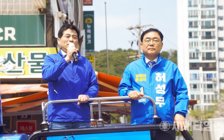 | ▲더불어민주당 소속 김민기 국회 국토교통위원장 허성무 후보 지원유세/사진=최성룡 기자 |