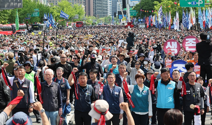 [세계타임즈 = 이장성 기자] 노동절인 1일 서울 도심 곳곳에서 노동단체들이 집회를 열었다. 양대노총 집회에는 주최 측 추산 3만3천명가량이 참가했다.전국민주노동조합총연맹은 이날 오후 2시 서울 종로구 세종대로 사거리 동화면세점 앞에서 2024 세계노동절 대회를 열고 정권 퇴진과 노동권 보장을 외쳤다.주최 측 추산 2만5천명의 참가자는 동화면세점 앞에서 덕수궁 대한문까지 약 600m 구간 6개 차로를 가득 메웠다.민주노총은 지난해 노조탄압 중단을 요구하며 분신해 숨진 건설노조 간부 고(故) 양회동 씨의 뜻을 이어가겠다며 윤석열 정권 퇴진, 모든 노동자의 노동기본권 쟁취, 노조법 2·3조 개정안(노란봉투법) 통과, 최저임금 인상 등 구호를 외쳤다.양경수 민주노총 위원장은 윤석열 정권 2년 동안 우리 사회 노동자들의 삶은 나락으로 곤두박질쳤다. 폭력배로, 공갈 협박범으로 매도당한 양회동 열사는 자존심을 지키기 위해 스스로의 몸에 불을 댕겼다고 말했다.민심을 외면한 정권은 민중의 준엄한 심판을 받았지만 반성하지 않고 있다며 우리 힘으로 윤석열 정권을 반드시 몰아낼 것이라고 말했다.참가자들은 오후 3시 30분께 집회를 마치고 중구 서울고용노동청까지 1.2㎞ 구간을 행진한다.