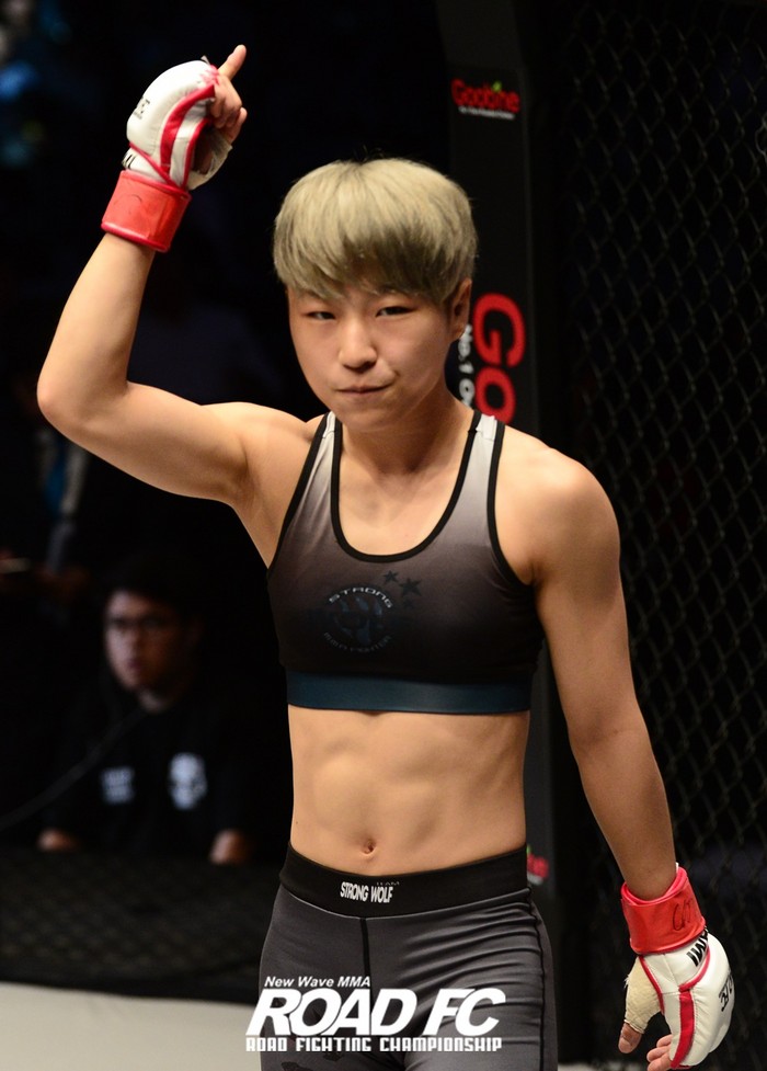 [세계타임즈 김인수기자] 2015년 가진 데뷔전에서 박정은은 ‘일본 격투 여왕’ 후지노 에미를 맞아 투지 넘치고 화끈한 타격전을 선보이며 깜짝 등장했다. 2016년 1월 XIAOMI ROAD FC 028에서 류샤오니를 서브미션으로 꺾으며 첫 승을 거뒀고, 박나영, 박시우에게 연승을 거두며 급성장했다.