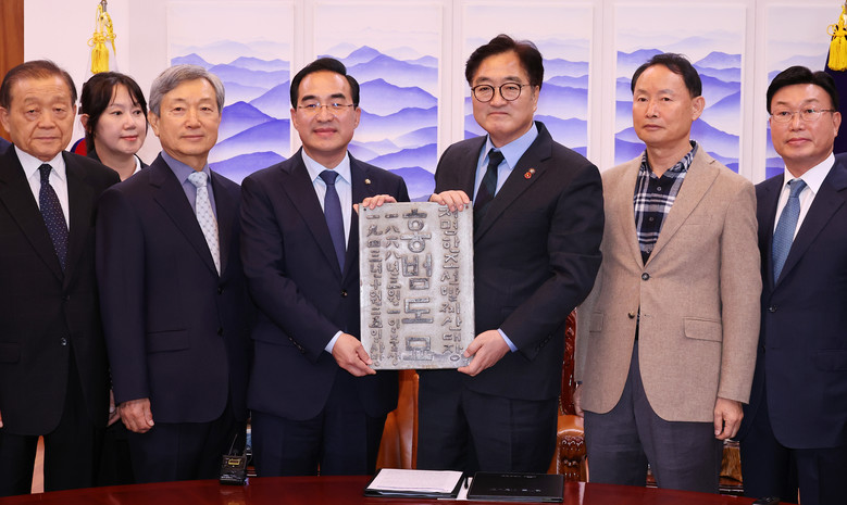 우원식 국회의장(오른쪽 세번째)이 22일 오후 국회에서 열린 홍범도 장군 묘비 전달식에서 박홍근 홍범도장군기념사업회 이사장에게 홍범도 장군 과거 묘역에 있던 묘비문을 전달하고 있다.