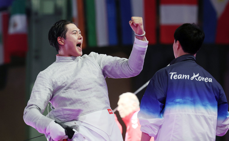 [세계타임즈 = 박채원 기자] 한국 남자 펜싱의 간판 오상욱(대전광역시청)이 2024 파리 올림픽 대한민국 선수단에 첫 금메달을 안겼다.오상욱은 28일(한국시간) 프랑스 파리의 그랑팔레에서 열린 파리 올림픽 남자 사브르 개인전 결승에서 파레스 페르자니(튀니지)를 15-11로 물리치고 우승을 차지했다.이번 올림픽 대한민국 선수단을 통틀어 나온 첫 금메달이다.사격 공기소총 10m 혼성 경기에서 박하준(KT)-금지현(경기도청)의 은메달, 수영 남자 400m 자유형 김우민(강원도청)의 동메달에 이은 이번 대회 대한민국 선수단의 3번째 메달이 금빛으로 장식됐다.생애 처음 출전한 2021년 도쿄 올림픽 때 개인전 8강에서 탈락했던 오상욱은 두 번째 도전에서 한국 남자 사브르 선수로는 최초로 올림픽 개인전 결승에 진출, '금빛 찌르기'까지 성공했다.이전까진 남자 사브르에선 2016년 리우데자네이루와 2021년 열린 도쿄 대회 때 김정환의 동메달이 올림픽 개인전 최고 성적이었다.2019년 세계선수권대회, 2019년과 올해 아시아선수권대회, 지난해 항저우 아시안게임에서 개인전 금메달을 보유한 오상욱은 올림픽 금메달까지 거머쥐며 한국 펜싱 선수 최초로 주요 국제대회 '개인전 그랜드슬램'도 달성했다.파리 올림픽 첫날부터 오상욱이 물꼬를 터 주며 한국 펜싱은 2008년 베이징 대회부터 5회 연속 올림픽 메달 수확에 성공했다.오상욱은 이날 첫 경기인 32강전에서 에반 지로(니제르)를 15-8, 16강전에서 알리 파크다만(이란)을 15-10으로 제압했고, 8강전에선 파레스 아르파(캐나다)를 15-13으로 따돌리며 순항했다.도쿄 올림픽 개인전 은메달리스트 사멜레와의 준결승전에선 초반 0-3으로 잠시 끌려다녔지만, 상대 템포를 빼앗는 공격이 살아나며 1피리어드를 마쳤을 때 8-4 더블 스코어로 앞서며 쾌승을 거두고 은메달을 확보했다.32강전에서 사브르 대표팀의 맏형 구본길(국민체육진흥공단)을 제압하고 준결승전에선 현재 세계랭킹 1위인 지아드 엘시시(이집트)를 잡아 기세가 오른 페르자니와의 결승전은 오히려 싱거울 뻔했다.특유의 런지를 활용한 공격이 빛을 발하며 주도권을 잡은 오상욱이 14-5까지 앞서며 가장 손쉬운 승리를 거두는 듯했다.하지만 마지막 한 점을 남기고 페르자니의 맹추격전에 시달리며 14-11까지 쫓겼고, 잠시 진땀을 뺀 오상욱은 경기를 승리로 마무리 짓고 그랑팔레에 태극기를 휘날렸다.이날 남자 사브르 개인전에 함께 출전한 2000년생 막내 박상원(대전광역시청)은 16강에서 선천펑(중국)에게 11-15로 패했고, 4번째 올림픽에 출전한 맏형 구본길은 32강전에서 페르자니에게 져 개인전 입상이 불발됐다.결승전에 앞서 열린 남자 사브르 개인 동메달 결정전에서는 사멜레가 엘시시를 15-12로 꺾고 도쿄 올림픽 은메달에 이어 2회 연속 개인전 메달을 가져갔다.여자 에페 개인전에선 송세라(부산광역시청)가 16강전에서 에스테르 무허리(헝가리)에게 6-15로 완패하며 탈락했고, 강영미(광주광역시 서구청)와 이혜인(강원도청)은 첫판인 32강에서 물러났다.여자 에페 개인전에선 세계 1위 비비안 콩(홍콩)이 결승전에서 오리안 말로(프랑스)를 13-12로 꺾고 금메달을 획득했고, 무허리가 3위에 올랐다.