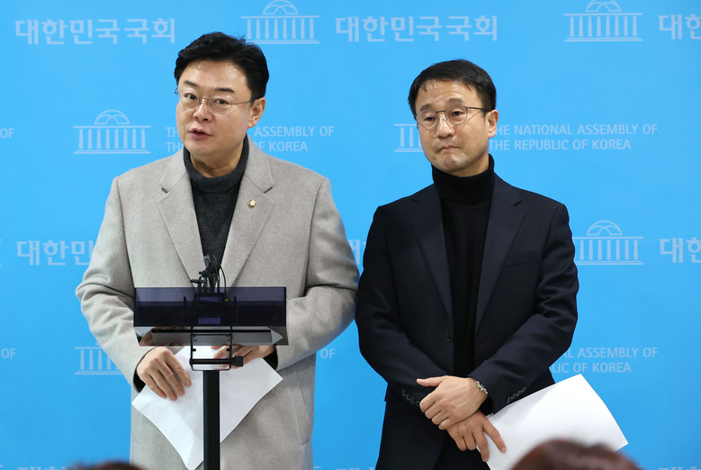 윤석열 정부의 비상계엄선포를 통한 내란혐의 진상규명 국정조사특별위원회 소속 국민의힘 김성원(왼쪽), 더불어민주당 한병도 간사가 21일 국회 소통관에서 합동참모본부 지휘통제실과 수도방위사령부 문서고 등 1차 현장조사 결과를 설명하고 있다. 2025.1.21