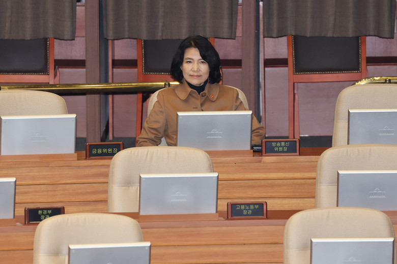이진숙 방송통신위원장이 27일 국회 본회의에서 방송통신위원회 회의 최소 의사정족수를 3인으로 하는 방송통신위원회의 설치 및 운영에 관한 일부개정법률안에 대한 표결을 지켜보고 있다. 2025.2.27