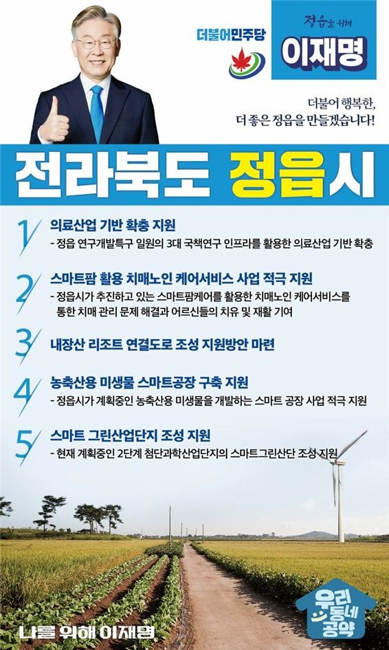 ‘우리동네공약’에 반영된 정읍시 주요 공약은 △ 전북 첨단의료복합단지 조성 지원, △ 서남권 노인치매안심센터 조성, △ 내장산리조트 연결도로 조성 지원, △ 농축산용미생물 아파트형 스마트공장 구축 지원, △ 정읍 첨단2단계 산업단지 '스마트 그린산업단지 조성' 지원 등 총 5건이다.
