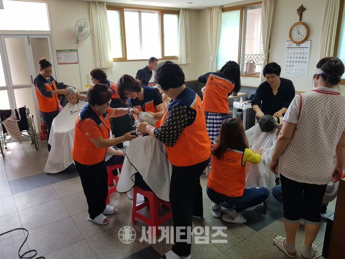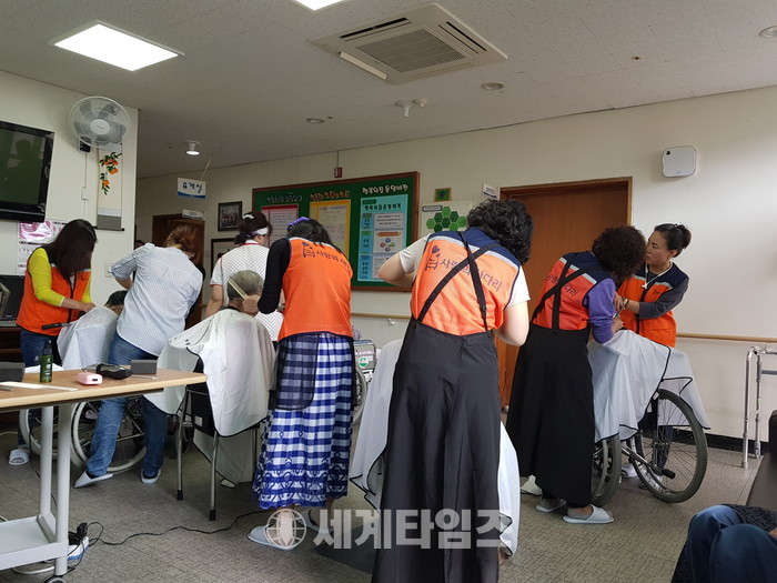 [대전=세계타임즈 이장성 기자] 다양한 봉사활동을 하고 있는 5천명 봉사 빅밴드 사랑의 사다리 밴드(리더 이정제)는 10일 오전9시30분부터 오후1시까지 충북 청주시 서원구 현도면에 위치한 꽃동네 행복의집 소망노인요양원에서 치매 및 와상 어르신들 50여분께 미용봉사와 말벗봉사로 사회적 효행을 실천하였다