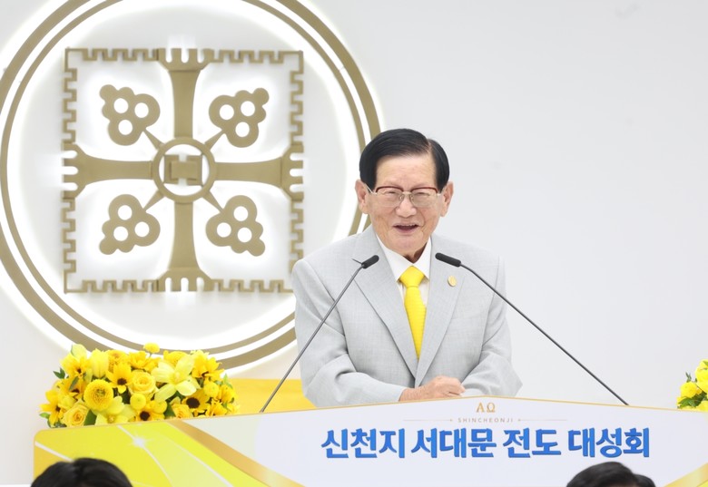 9일 서울 서대문구 소재 신천지 서대문교회에서 열린 ‘신천지 서대문 전도 대성회’에서 이만희 총회장이 강연을 진행하고 있는 모습.