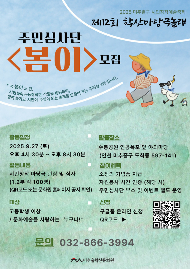 주민심사단 ‘봄이’는 오는 9월 27일 수봉공원 인공폭포 앞에서 개최되는 미추홀구 시민창작예술축제 학산마당극 놀래에서 ‘마당 예술동아리’의 창작 공연을 관람하고 심사에 참여하게 된다.
