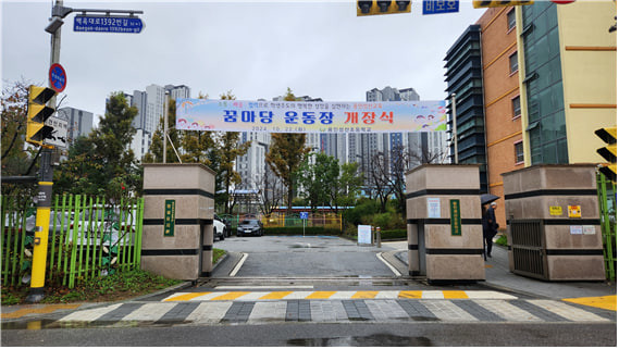 | ▲성산초등학교 정문에 걸려있는 꿈마당 운동장 개장식 현수막 |