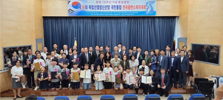 ▲2024년 8월 24일 독립기념관에서 열린 제36회 독립선열정신 선양 국민통합 전국웅변스피치대회를 마치고 입상자와 대회 관계자들이 기념촬영을 하고 있다.