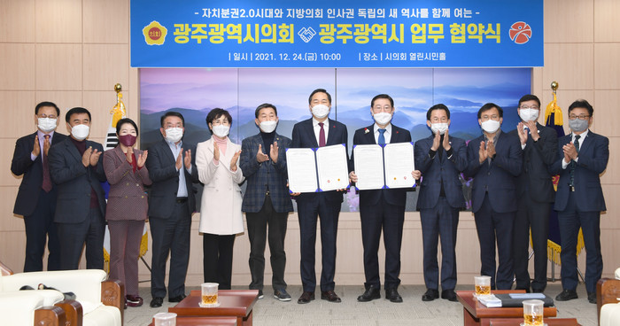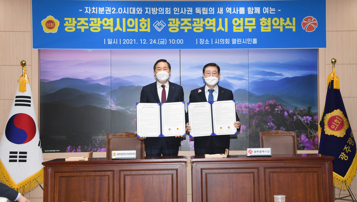 [광주=세계타임즈 손권일 기자] 광주광역시와 광주광역시의회가 24일 시의회 열린시민홀에서 지방의회 인사권 독립에 따른 인사운영 등 업무 전 분야에 대한 협약을 체결했다.
