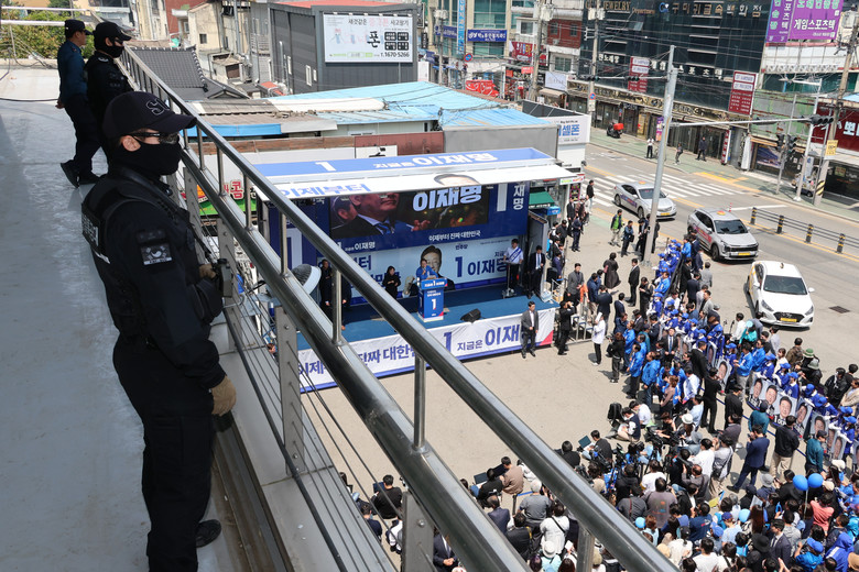더불어민주당 이재명 대선 후보의 대구·경북(TK) 지역 유세가 열린 13일 경북 구미시 구미역광장에서 경찰특공대원들이 경호·경비 활동을 하고 있다. 2025.5.13