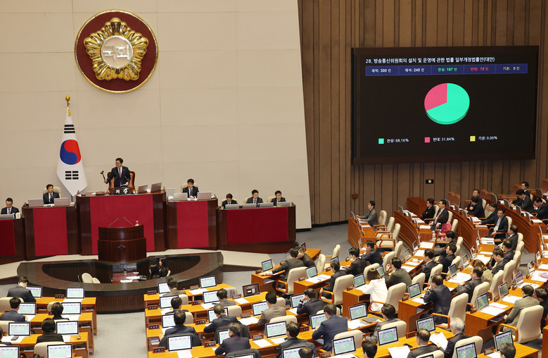 27일 국회 본회의에서 방송통신위원회의 설치 및 운영에 관한 법률 일부개정법률안이 가결되고 있다. 2025.2.27