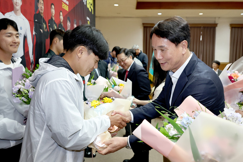 [대전 세계타임즈=이채봉 기자] 대전시의회 이상래 의장은 17일 대전 근현대사 전시관 대회의실에서 개최된 ‘대전시청·체육회 직장운동경기부 창단식’에 참석해 이장우 대전시장과 이승찬 대전시 체육회 회장을 비롯한 관계자들과 인사를 나눴다.