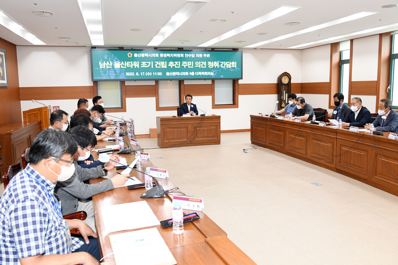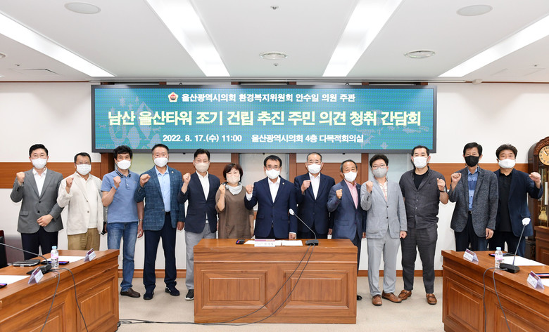 [울산 세계타임즈=이호근 기자] 울산광역시의회 안수일 의원(환경복지위원회)은 17일 오전 11시 시의회 4층 다목적회의실에서 ‘남산 울산타워 조기 건립 추진 주민 의견청취 간담회’를 개최했다.