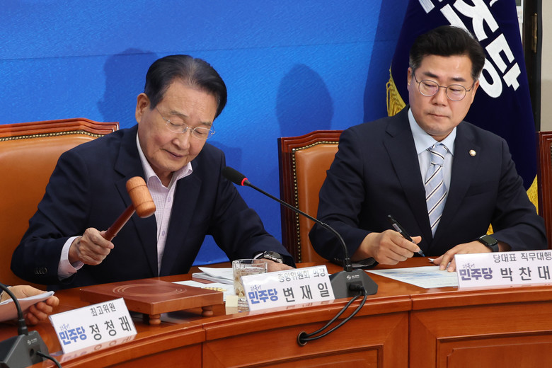 더불어민주당 변재일 중앙위원회 의장(왼쪽)이 12일 오전 서울 여의도 국회에서 중앙위원회 회의를 개회하고 있다.