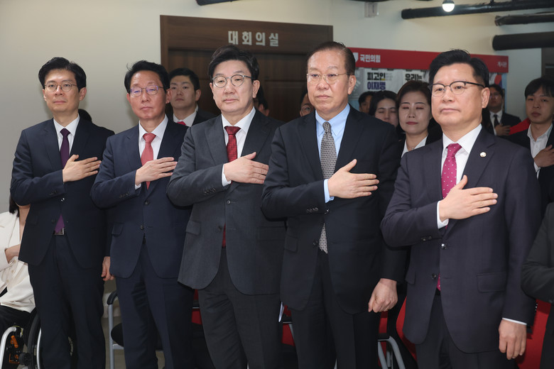 국민의힘 권영세 비상대책위원장과 권성동 원내대표가 전날 서울 여의도 중앙당사에서 열린 사무처당직자 조회에서 국기에 대한 경례를 하고 있다. 2025.4.7