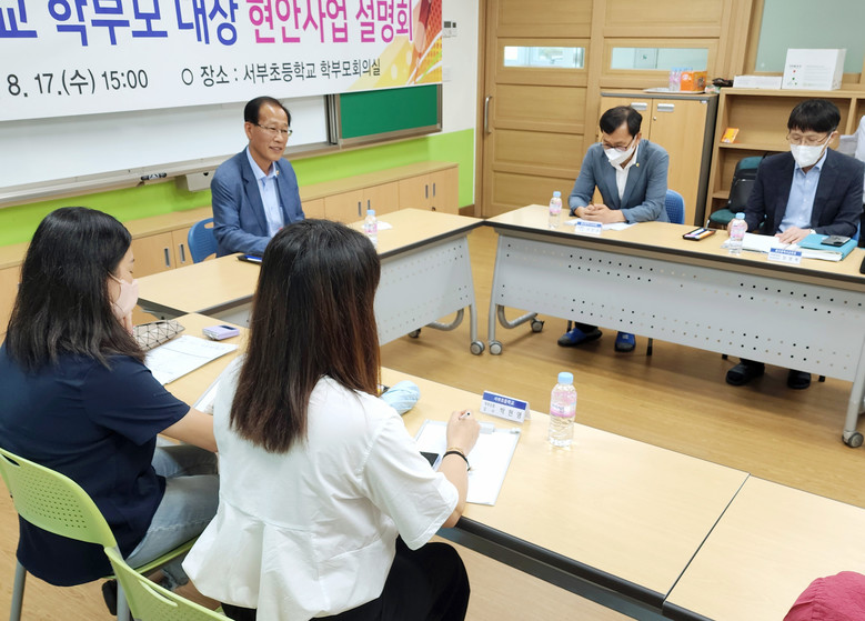 이번 설명회는 지난 7월 26일, 강대길 부의장이 주관한 ‘서부초 교육여건 개선을 위한 의견청취 간담회‘에서 학부모들이 제기한 급식소 증축 등 여러 가지 요구 사항에 대한 교육청의 입장과 처리 계획을 설명하는 형식으로 진행되었다.