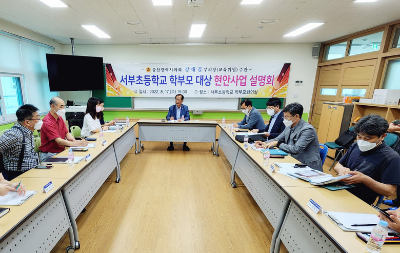 [울산 세계타임즈=이호근 기자] 울산광역시의회 강대길 부의장(교육위원회)은 17일 서부초 학부모회의실에서 서부초 학부모회장단과 교육청, 학교 관계자가 참석한 가운데 아프간 특별기여자 자녀 공교육 안착 지원과 서부초 교육여건 개선을 위한 학부모 대상 현안 사업 설명회를 가졌다.