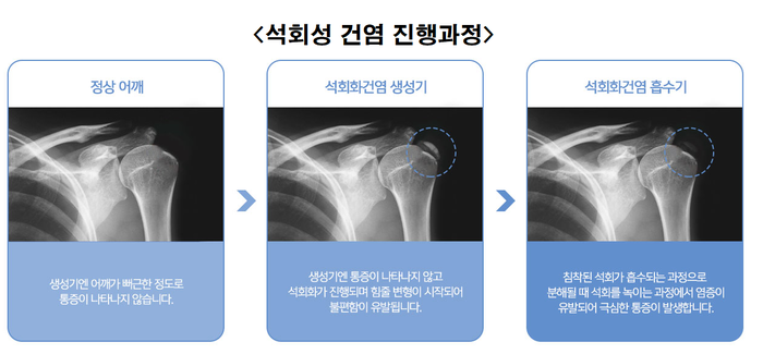 허동범 연세스타병원 병원장(정형외과 전문의)은 “석회성 건염은 어깨에 갑자기 칼로 찌르는 듯한 극심한 통증을 동반하는 경우가 많다. 이로 인해 한밤 중에 응급실을 찾는 분들도 많다. 힘줄 세포들이 석회를 이물질로 인식해 녹이는 과정에서 힘줄 주변에 강한 염증 반응을 일으키기 때문에 극심한 통증이 동반되지만, 아주 심한 경우가 아니면 치료는 쉬운 편에 속한다”고 전했다.