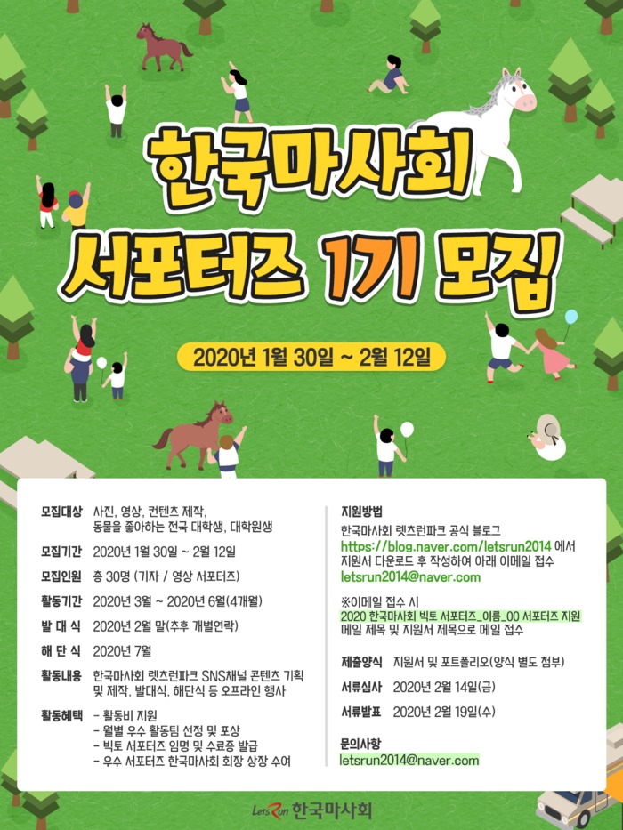 올해 1기를 시작으로 출범하는 ’빅토 서포터즈‘는 평소 말산업, 경마 등 한국마사회의 콘텐츠에 관심을 갖고 있는 대학생(대학원생)이라면 누구나 지원이 가능하다.