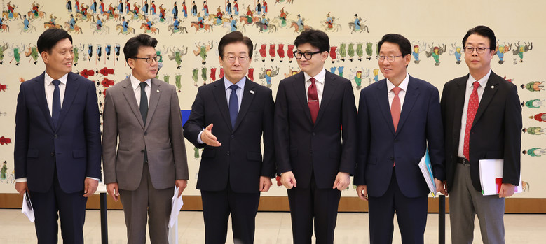 왼쪽부터 더불어민주당 조승래 수석대변인, 진성준 정책위의장, 이재명 대표, 국민의힘 한동훈 대표, 김상훈 정책위의장, 곽규택 수석대변인. 2024.9.1
