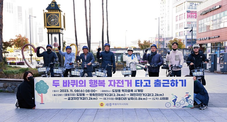 [세종 세계타임즈=이채봉 기자] 세종특별자치시의회(의장 이순열)는 8일 오전 8시부터 도담동 먹자골목 시계탑에서 ‘두 바퀴의 행복, 자전거 타고 출근하기’ 행사를 진행했다.