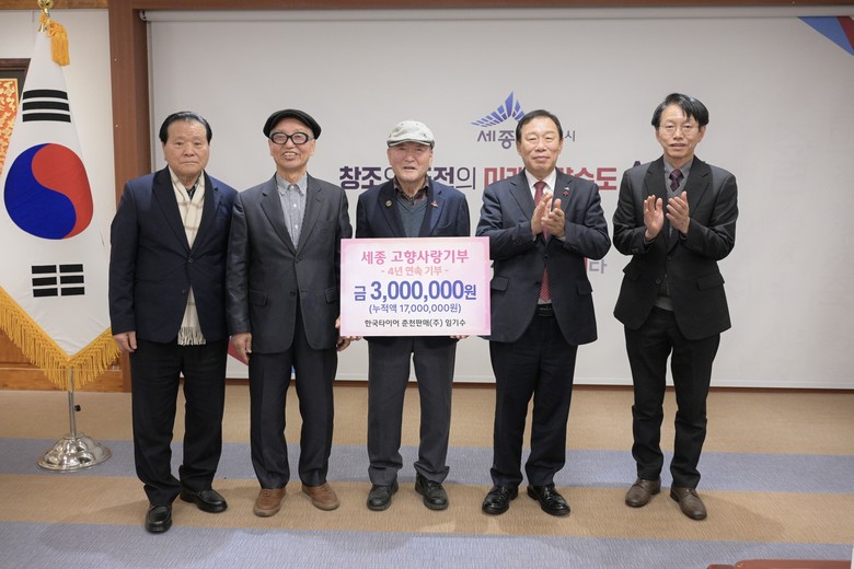[세종 세계타임즈=이채봉 기자] 세종특별자치시(시장 최민호)는 한국타이어 춘천판매㈜ 임기수 회장이 7일 고향사랑기부금 300만 원을 기부했다고 밝혔다.