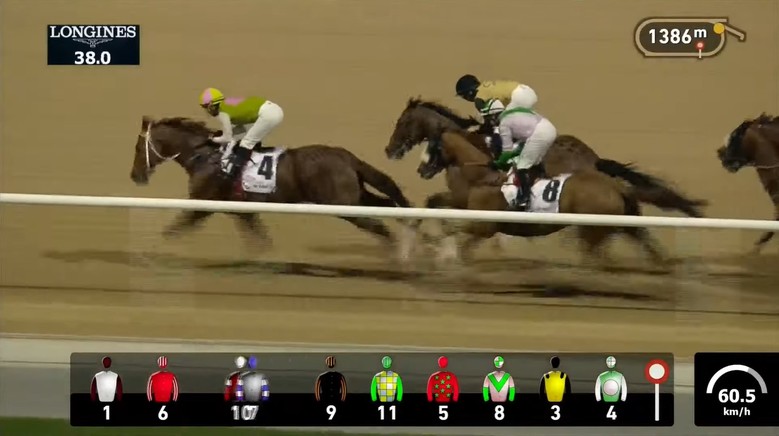 지난 1월 12일 치룬 데뷔전에서는 중위권에서 경주를 전개하다 점차 후미로 밀리며 8위를 기록, 아쉬운 결과를 거뒀다. 이후 4주간의 현지 적응과 조교를 바탕으로 컨디션을 끌어올린 ‘심장의고동’은 지난 9일 두 번째 예선 무대에 출전했다. ‘심장의고동’은 메이단 경마장 5경주로 펼쳐진 2000m 일반 핸디캡 경주에 출전했으며 이번에도 문세영 기수는 함께였다.