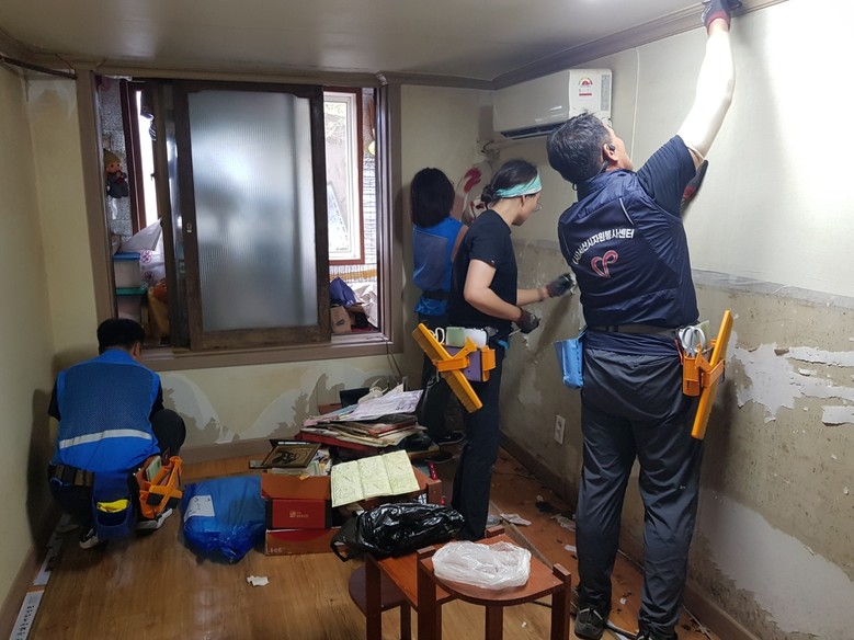 센터는 7월 18일부터 수해 쓰레기 수거와 가재도구 및 토사 정리 등 긴급 복구 활동을 시작했고, 이후 실내 공간 복구 수요가 증가함에 따라 전문 봉사단체와 함께 도배·장판 시공을 통해 2차 복구에 본격 착수했다.