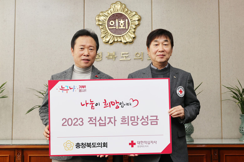 [충북 세계타임즈=이현진 기자] 충북도의회(의장 황영호)는 2023년 2월 1일 도의회 의장실에서 황영호 의장, 김경배 적십자사 충북지사 회장이 참석한 가운데 적십자 특별회비 전달식을 개최하고 따뜻한 온정을 전했다.