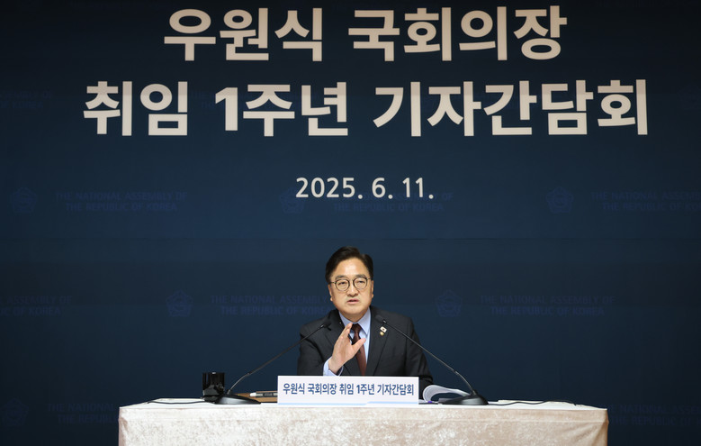 우원식 국회의장이 11일 국회 사랑재에서 열린 취임 1주년 기자간담회에서 취재진의 질문에 답변하고 있다. 2025.6.11 [국회사진기자단]