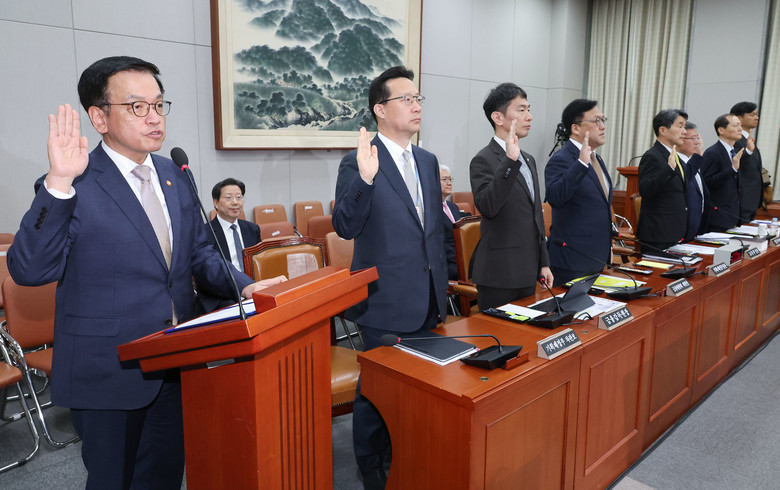 최상목 부총리 겸 기획재정부 장관이 16일 국회에서 열린 법제사법위원회 전체회의에서 선서하고 있다.