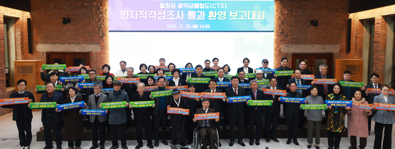 이날 환영 보고대회는 2025년 한해를 돌아보며, 지난 11월 충청권 광역급행철도 사업의 민자적격성조사 통과를 기념함과 동시에, CTX 사업 추진 과정의 성과를 함께 공유하고 향후 사업이 안정적으로 추진될 수 있도록 도민과 민간단체, 관계기관 간 공감대를 형성하기 위해 마련되었다.