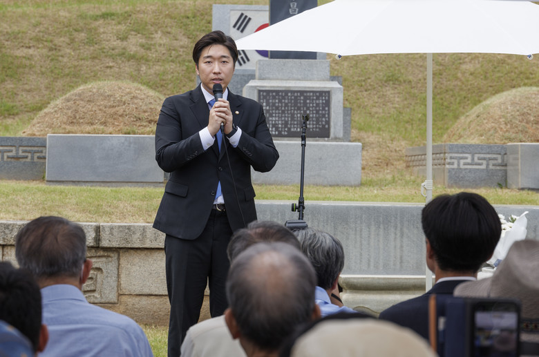 제79주년 광복절을 맞이해 항일독립선열 선양단체 연합(항단연)이 15일 서울 용산구 효창공원 내 삼의사 묘역에서 주최한 광복절 기념식에 참석한 백범 김구 선생의 증손자인 더불어민주당 김용만 의원이 발언하고 있다.