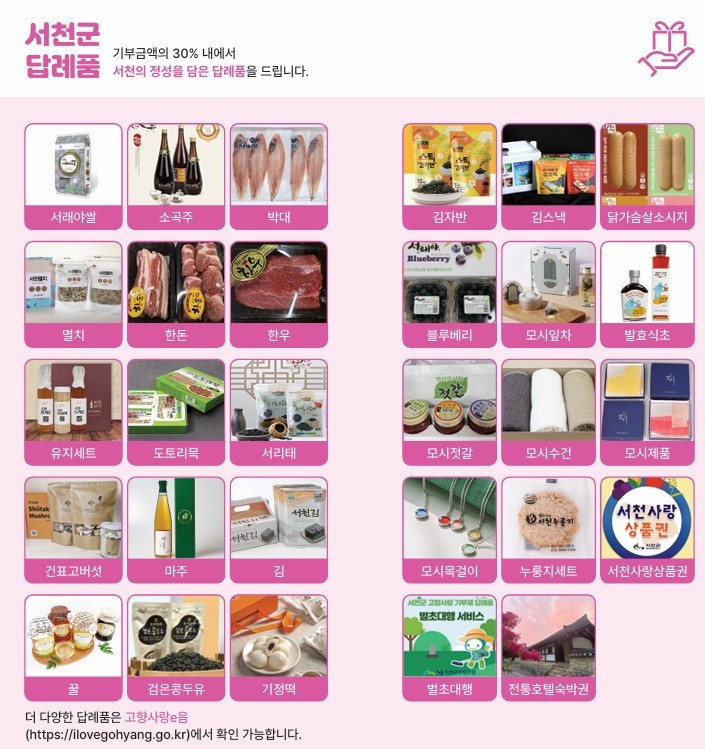 한편, 서천군은 현재 39개 품목을 34개 업체를 통해 제공 중이며, 매년 정기적인 공급업체 모집을 통해 기부자 선택의 폭을 넓혀가고 있다.