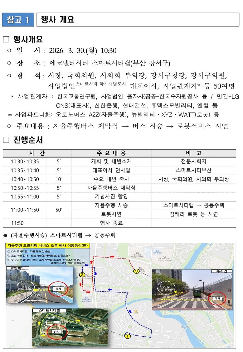 국가시범도시 사업법인 스마트시티부산㈜(대표 이계형)는 이번 서비스 개시를 계기로 자율주행과 로봇 기반 도시서비스 실증을 본격화하고, 데이터 기반 운영을 통해 스마트시티 모델 확산 기반을 마련할 계획이다.