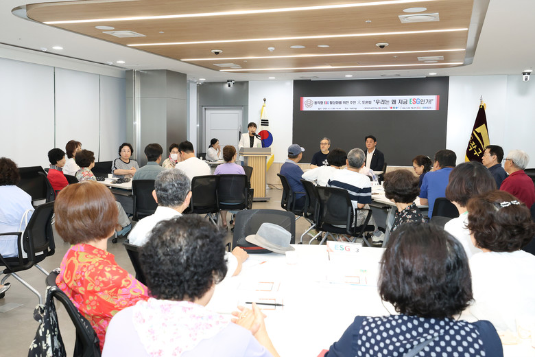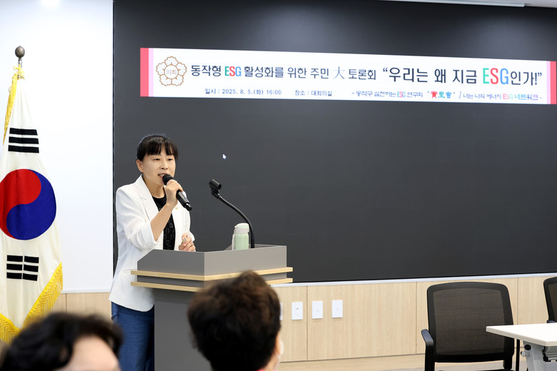 [동작구 세계타임즈=이장성 기자] 동작구의회(의장 정재천) 의원 연구단체 ‘동작구 실천하는 ESG 연구회, 實里會(대표의원 김영림)’는 5일 동작구청 5층 대회의실에서 「우리는 왜 지금 ESG인가!」를 주제로 주민 대토론회를 개최했다.