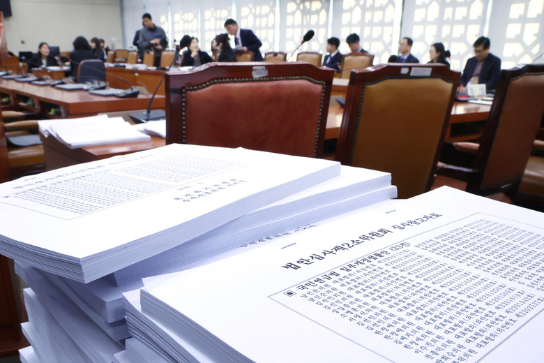20일 국회 보건복지위원회 법안심사제2소위원회의장에 국민연금법 개정안 등 법안 자료가 쌓여 있다. 2025.2.20